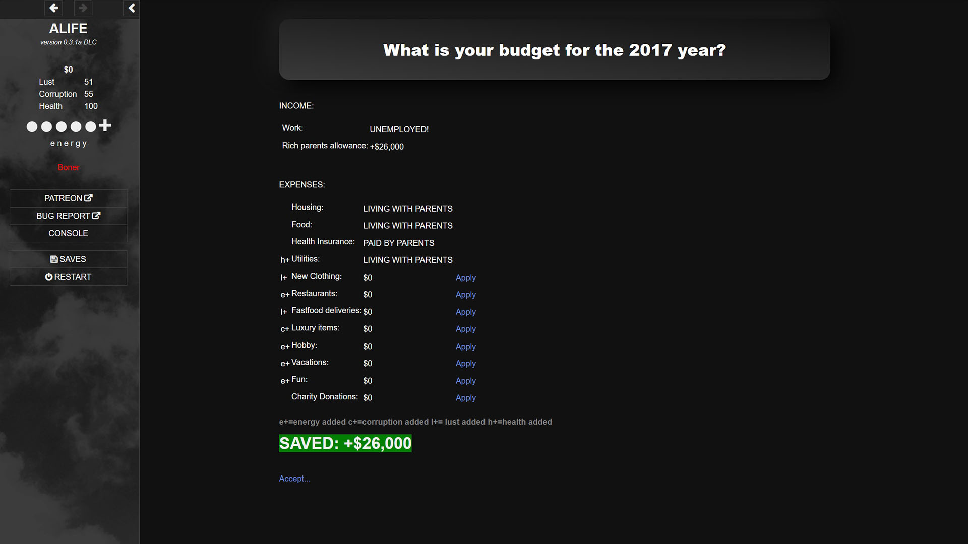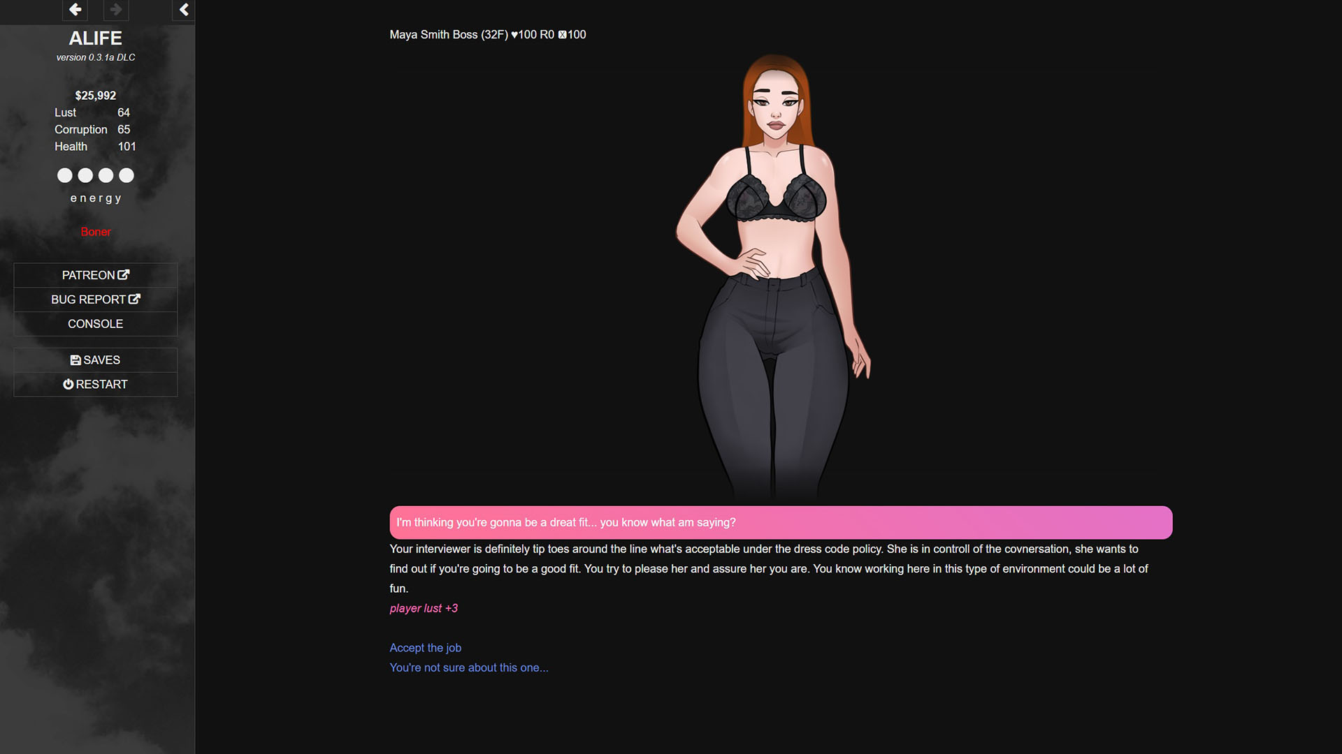 Thank you for your feedback! Yeah, it still is 0.3a, so there are a lot of polish to be done. Some of those problems would already be fixed in 0.4a with more content to be added. The property, like cars and real estate, will be expanded too. Not only could you own multiple, but they will also appreciate\depreciate in value over time. For the relationships with wife\girlfriend\boyfriend? more events are planned for cheating, co-living, making decisions as a couple, etc.